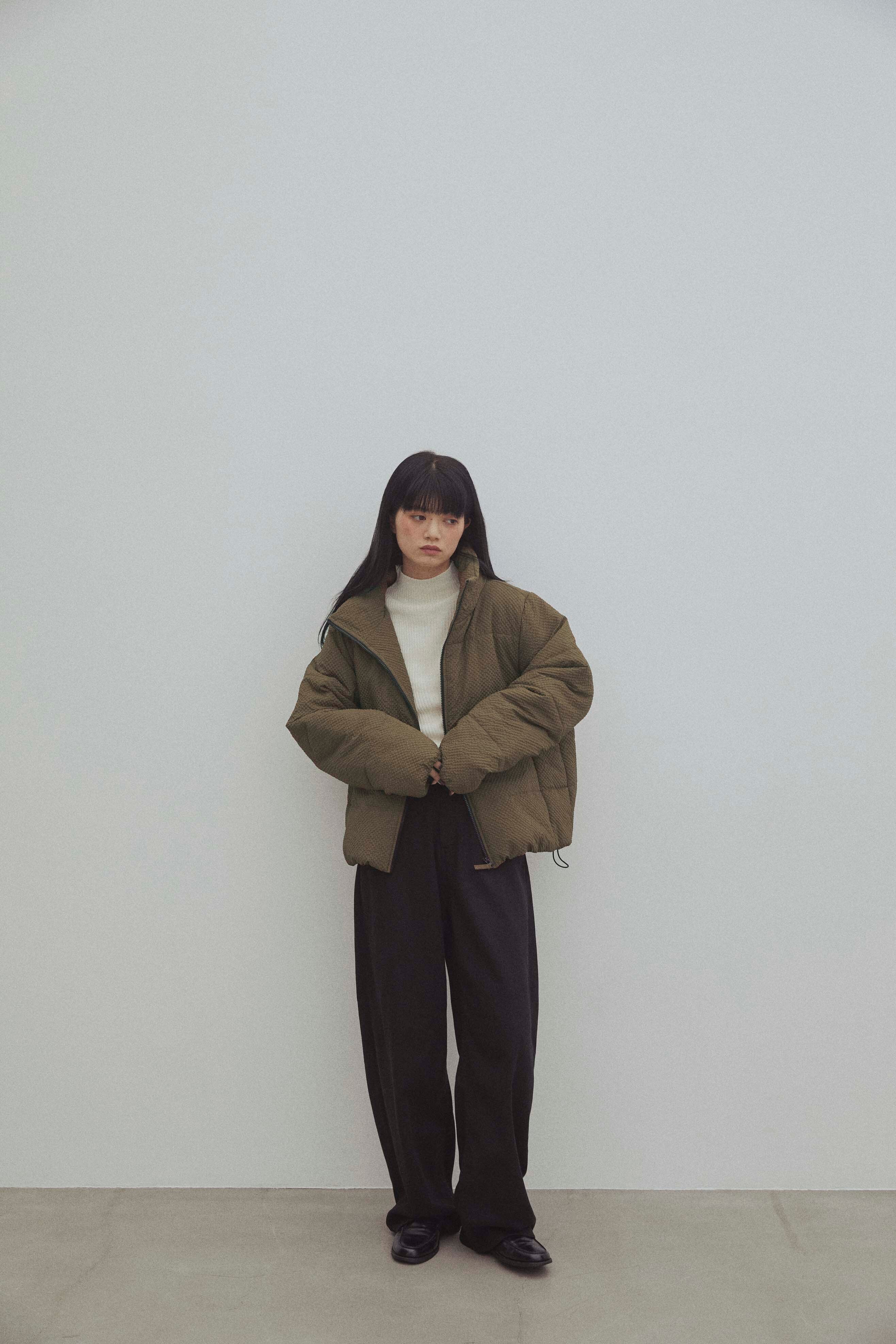 ふんわりとしたボリュームシルエットとハイネック仕様で、