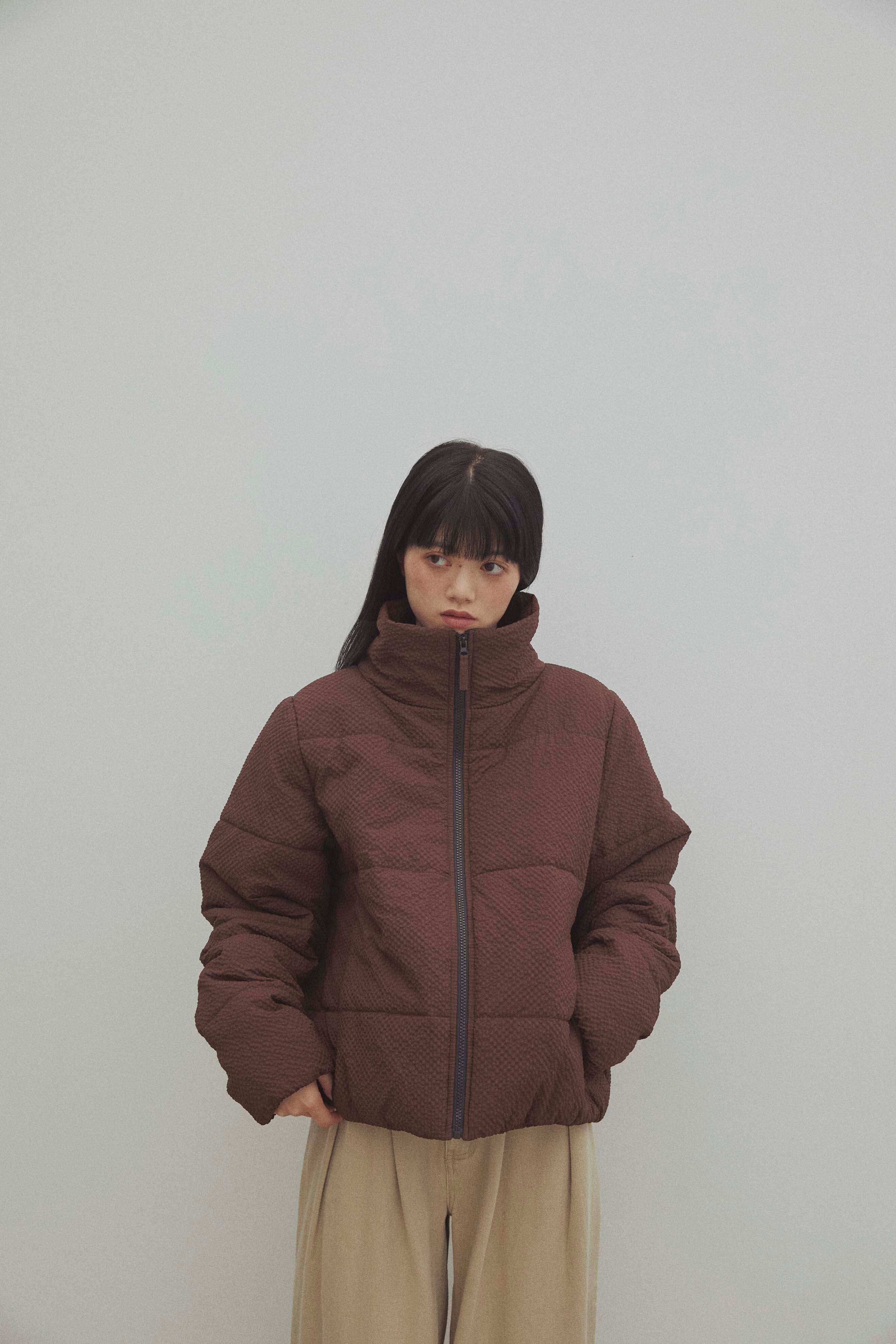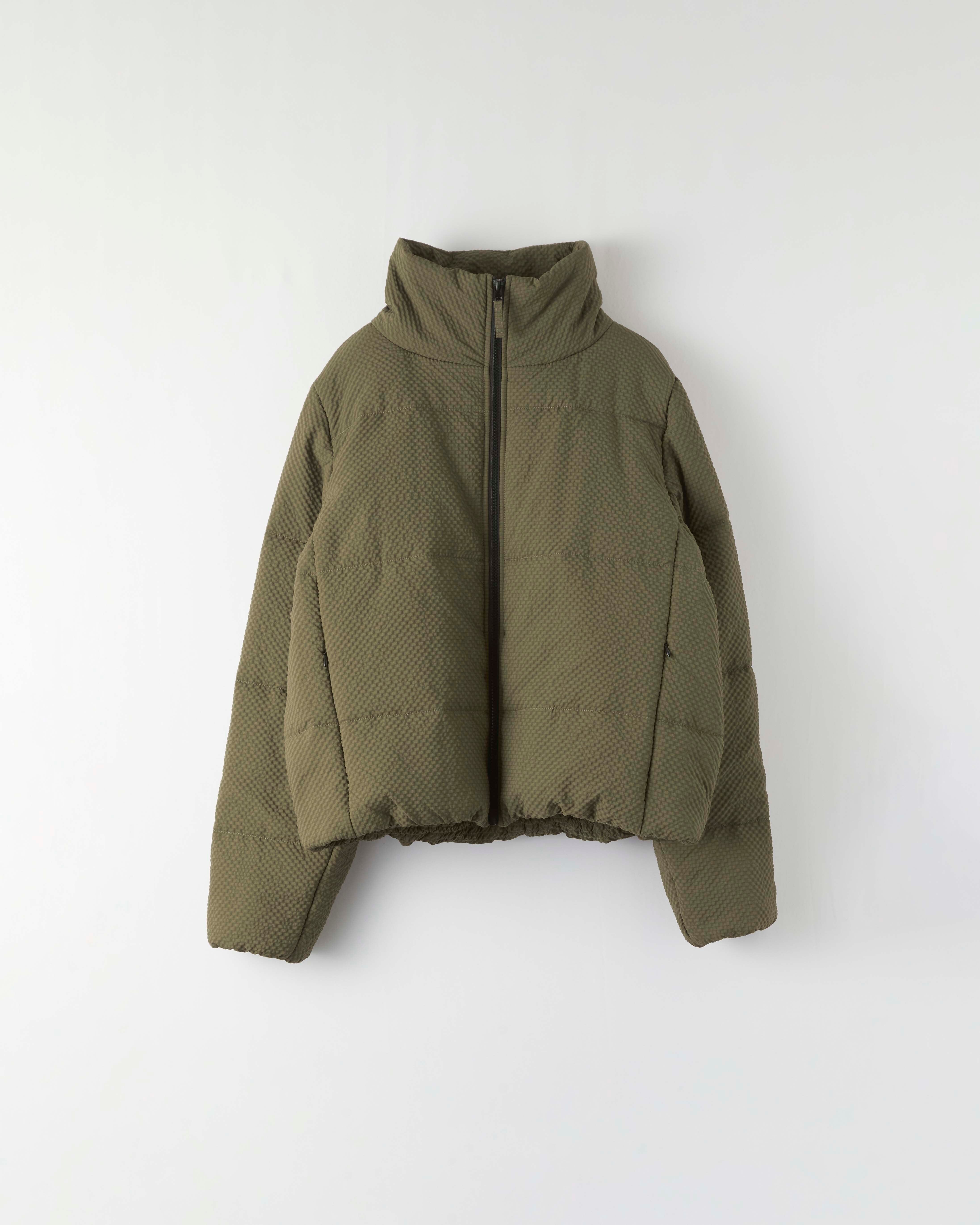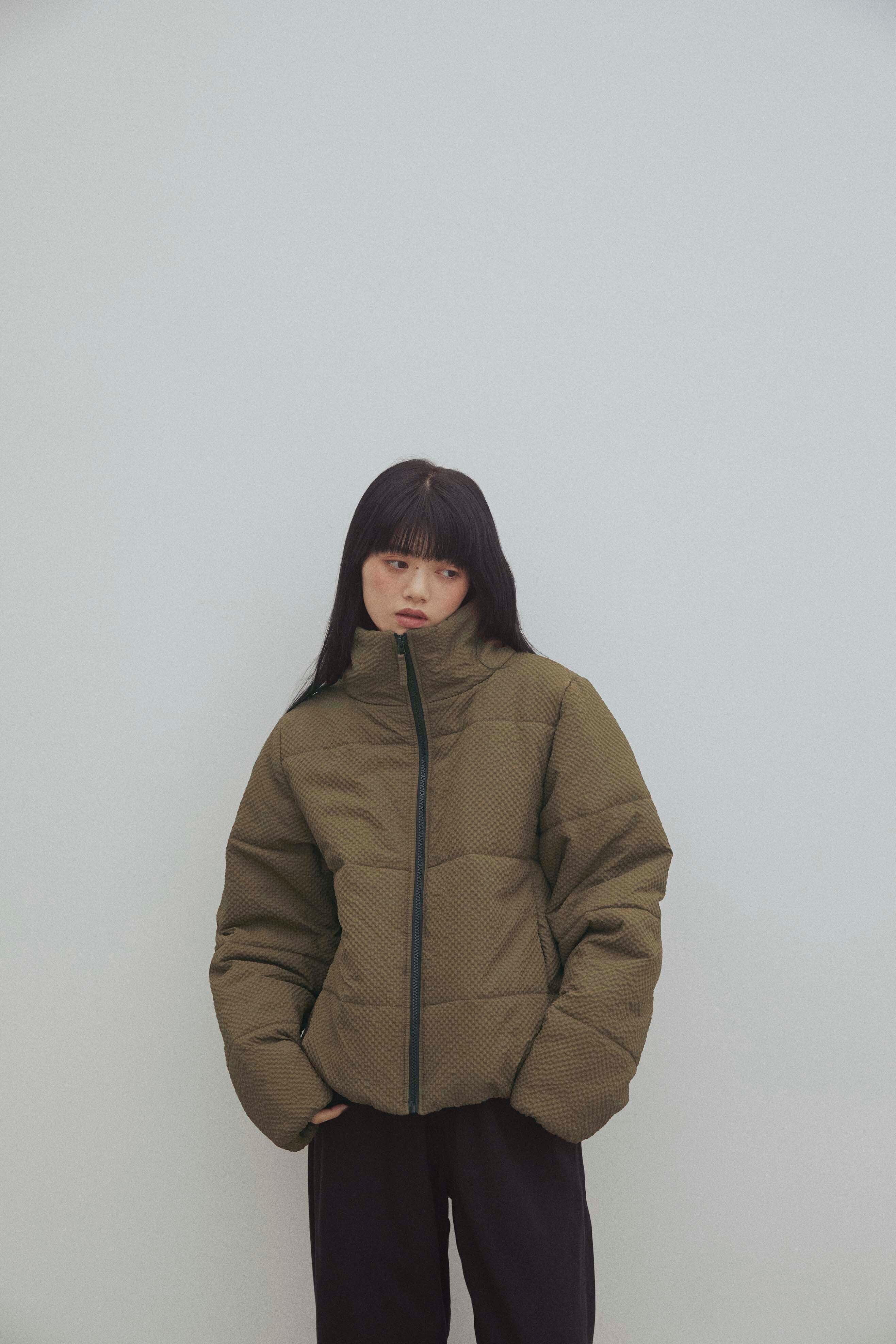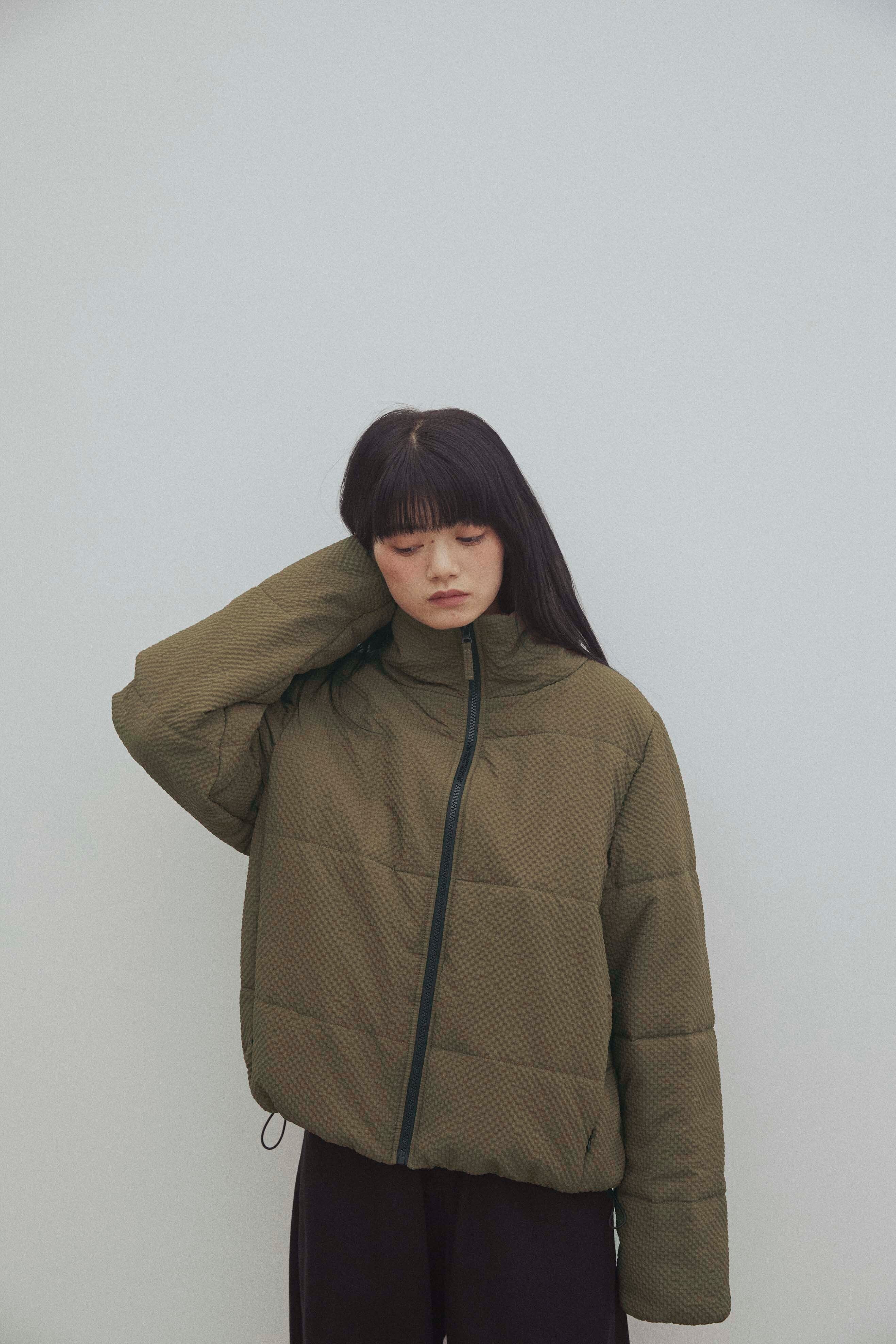 立体感のあるワッフル調の細かいチェック生地が特徴的な中綿アウター。