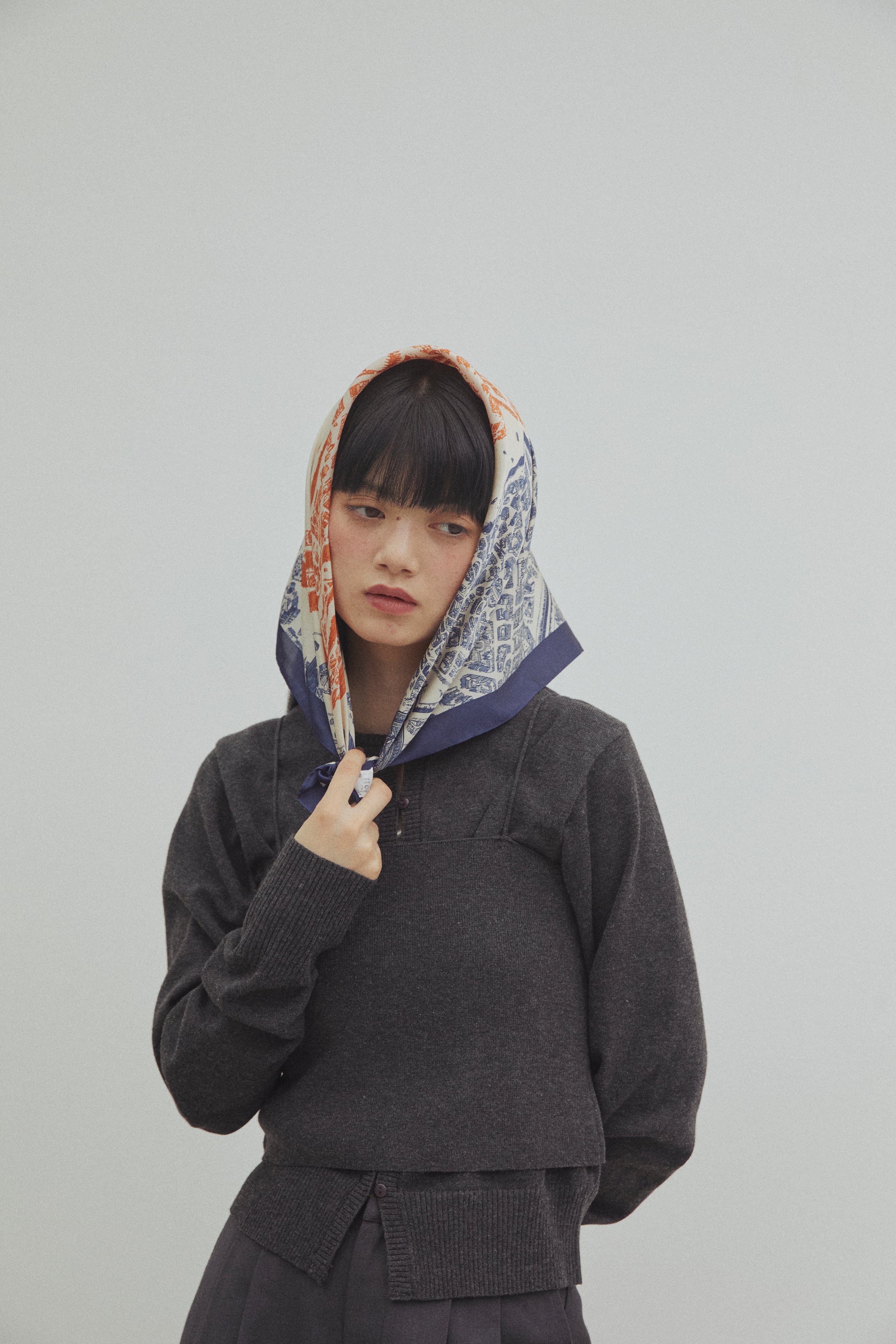 ブルーとオレンジのスカーフはコーデの差し色に。
