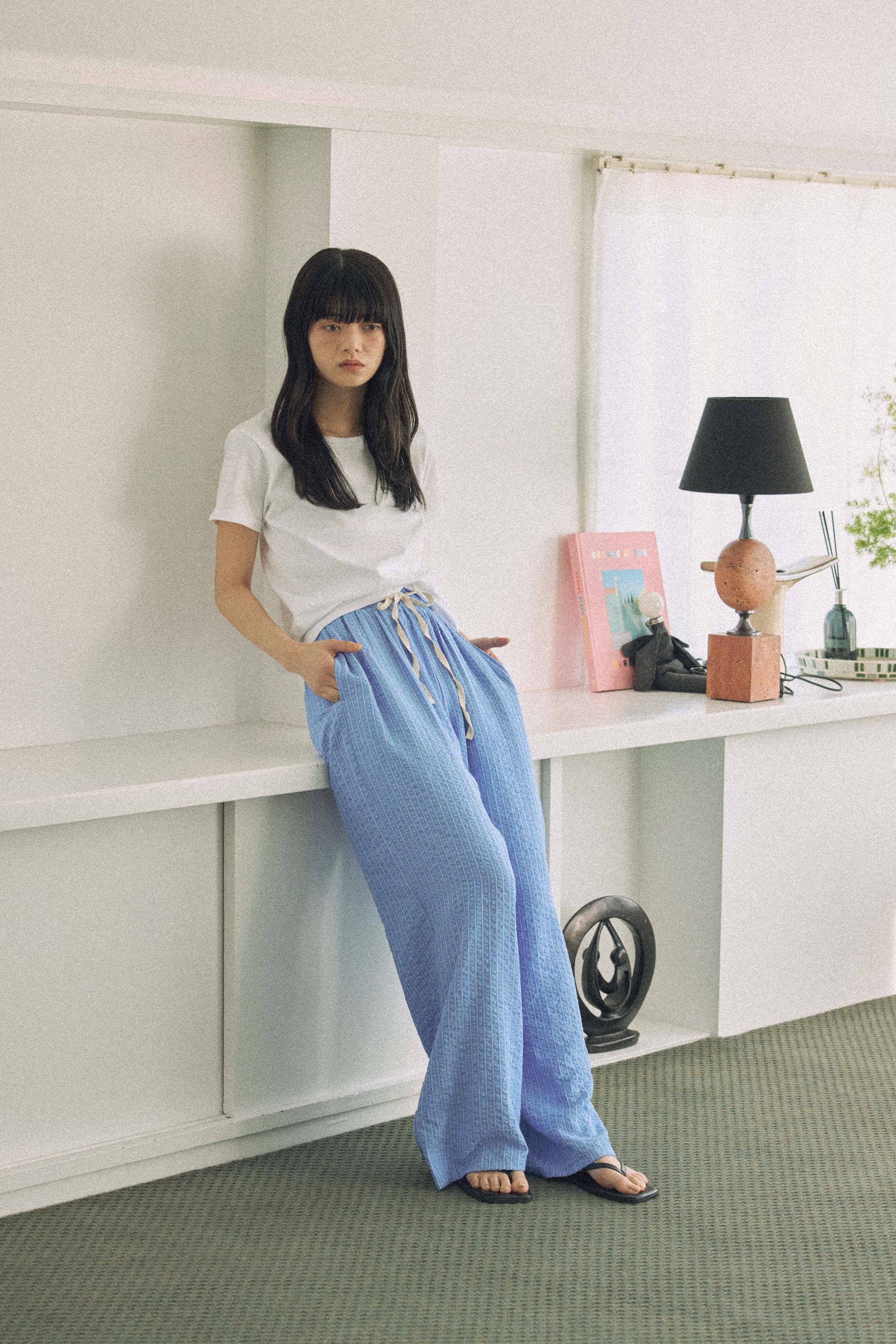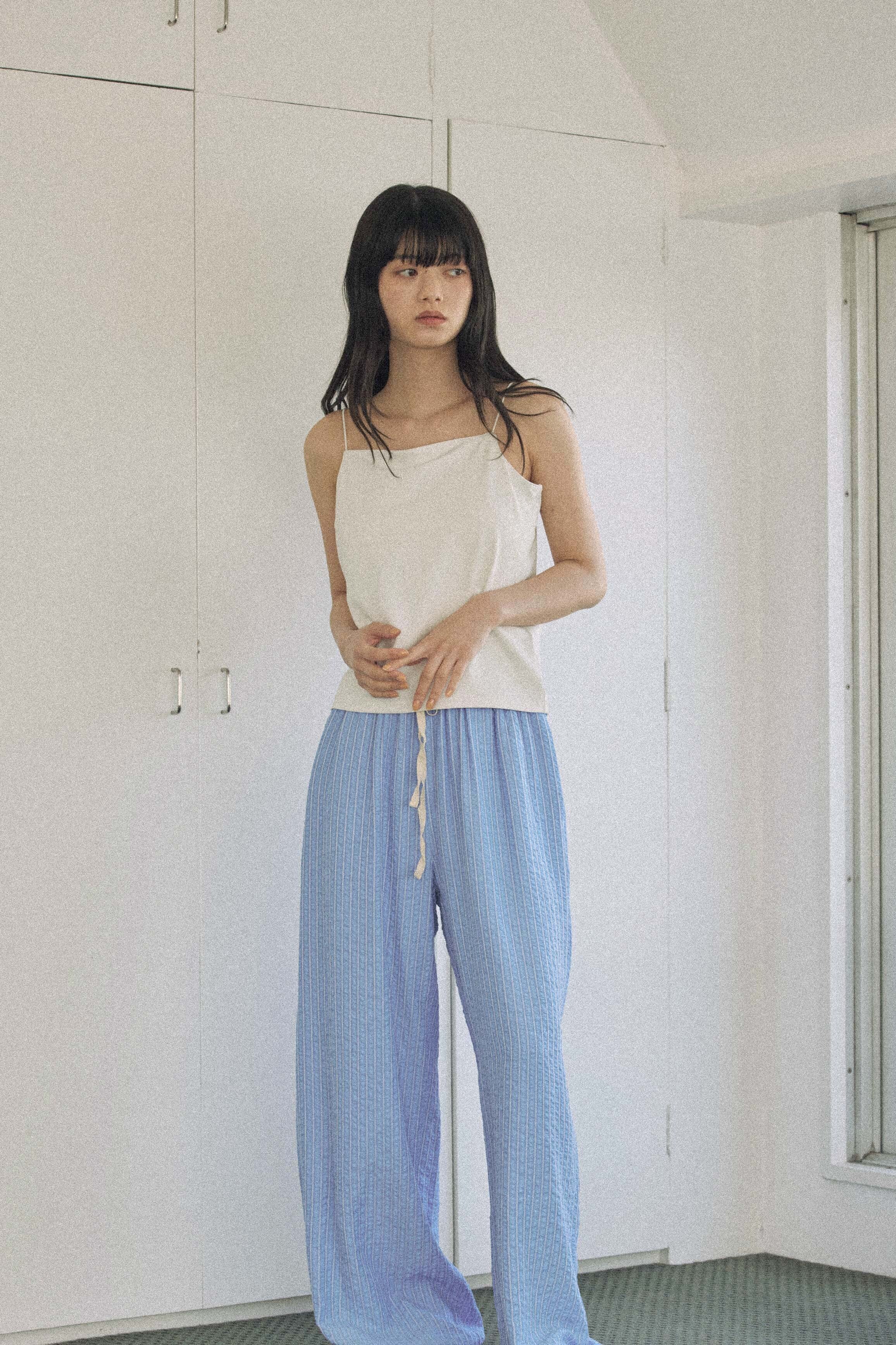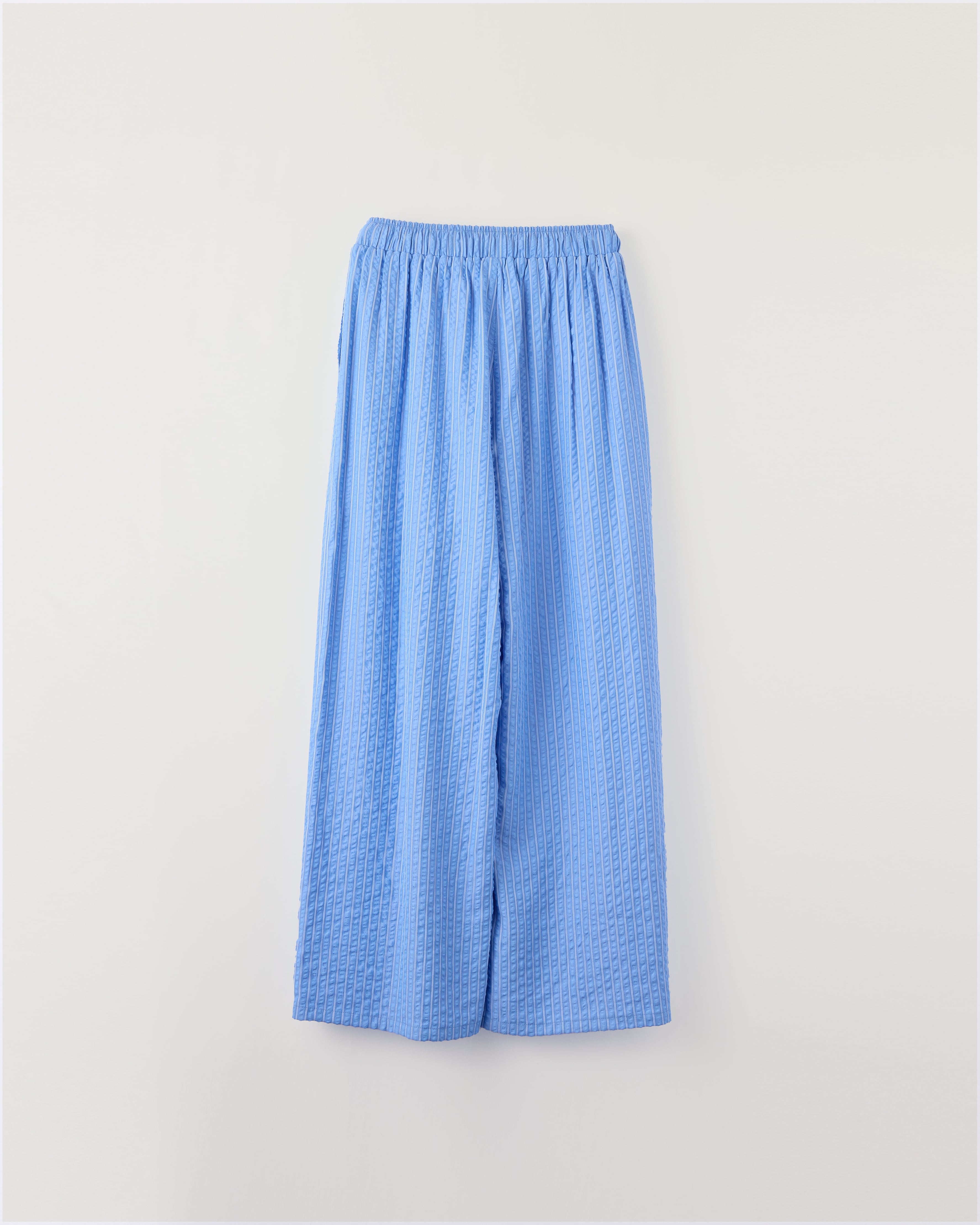 爽やかなブルーストライプが印象的な、軽やかなロングパンツ。