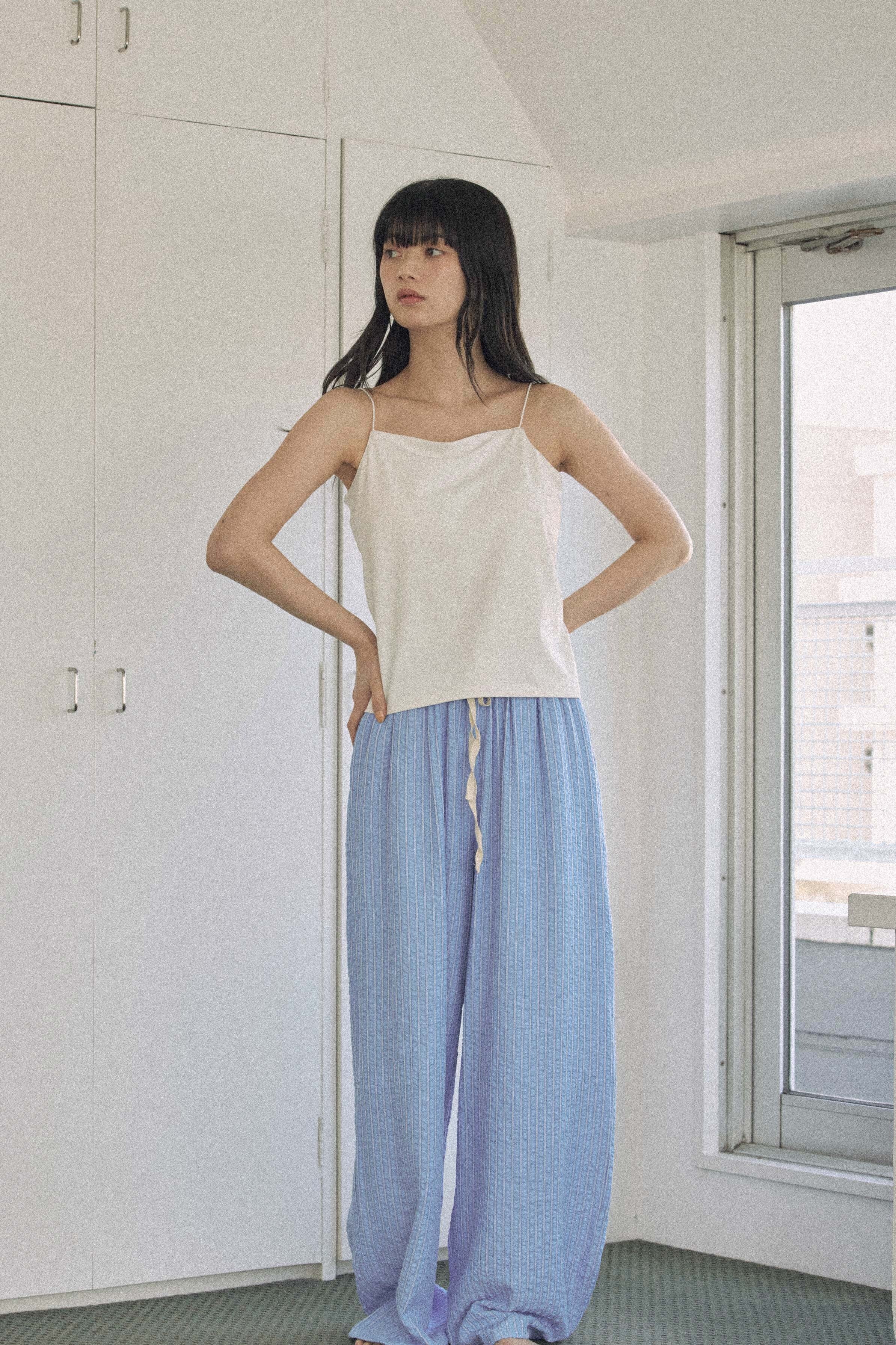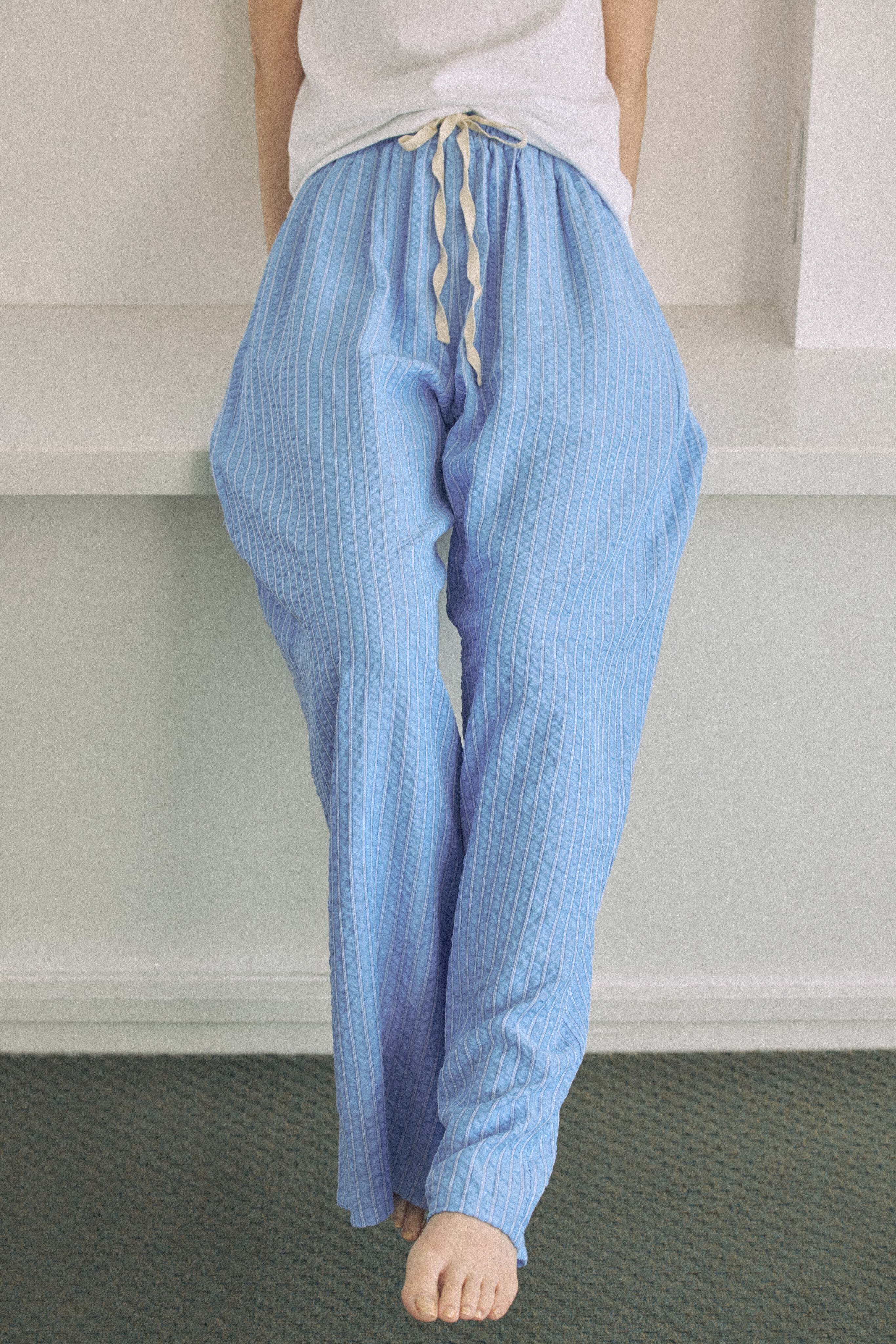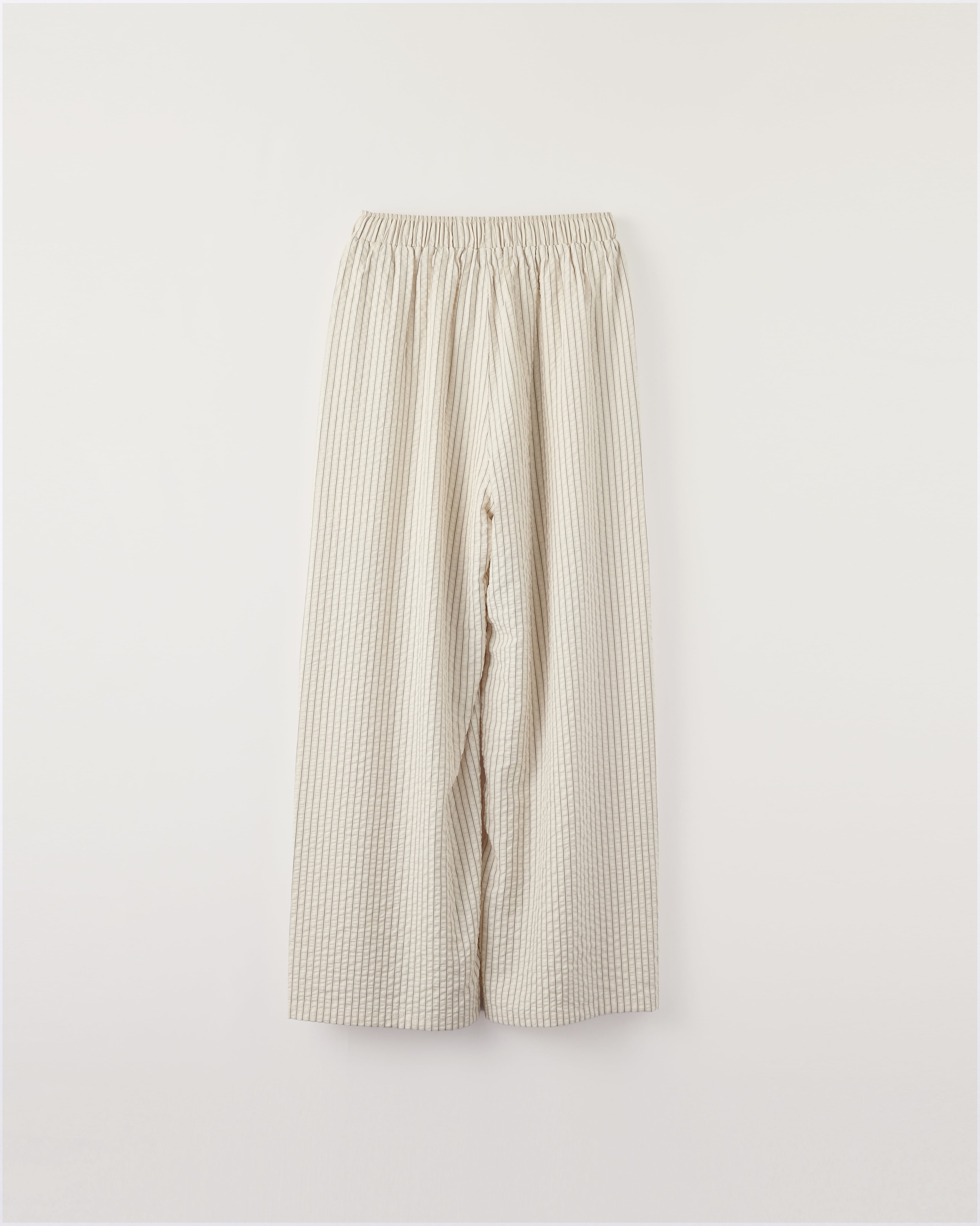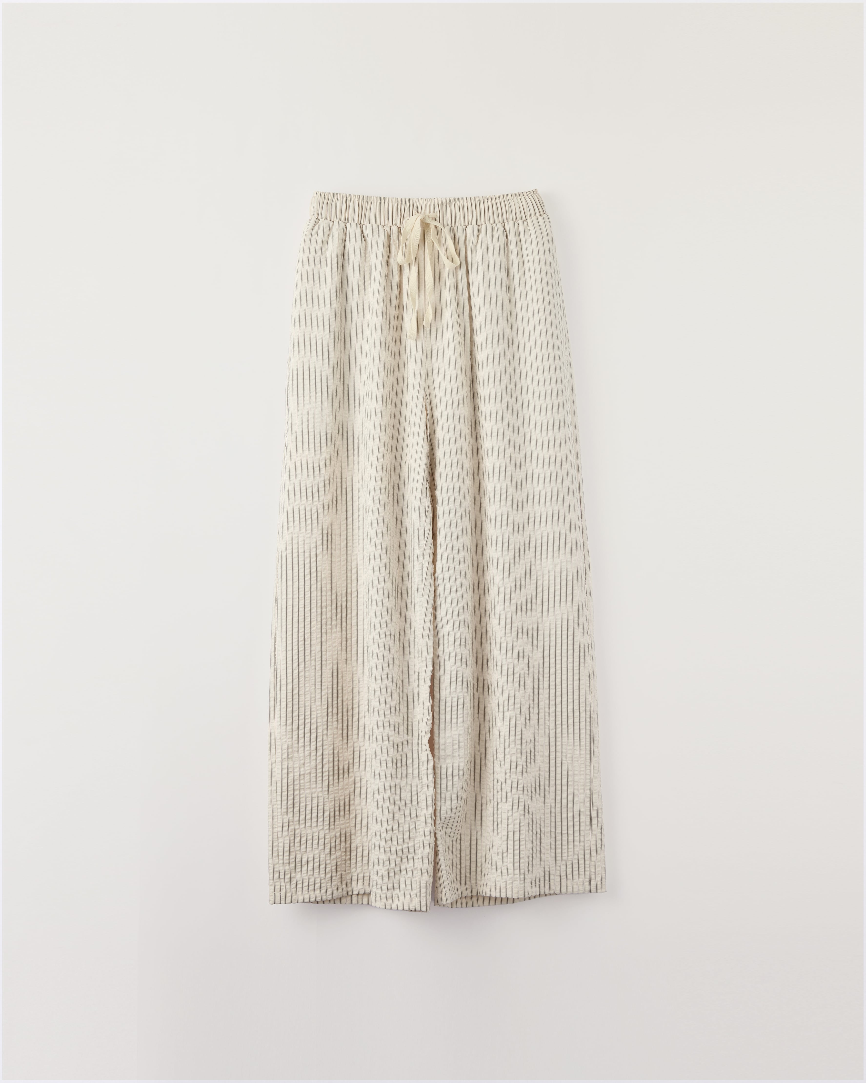 爽やかなブルーストライプが印象的な、軽やかなロングパンツ。