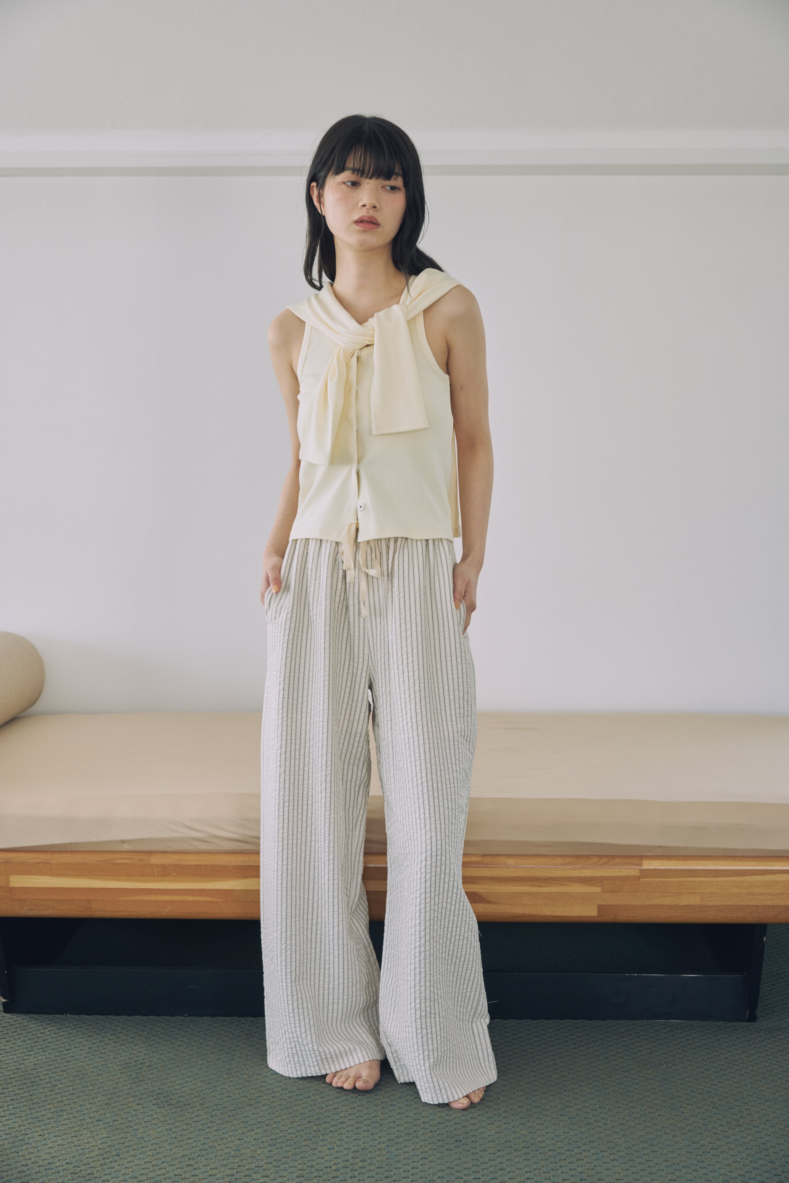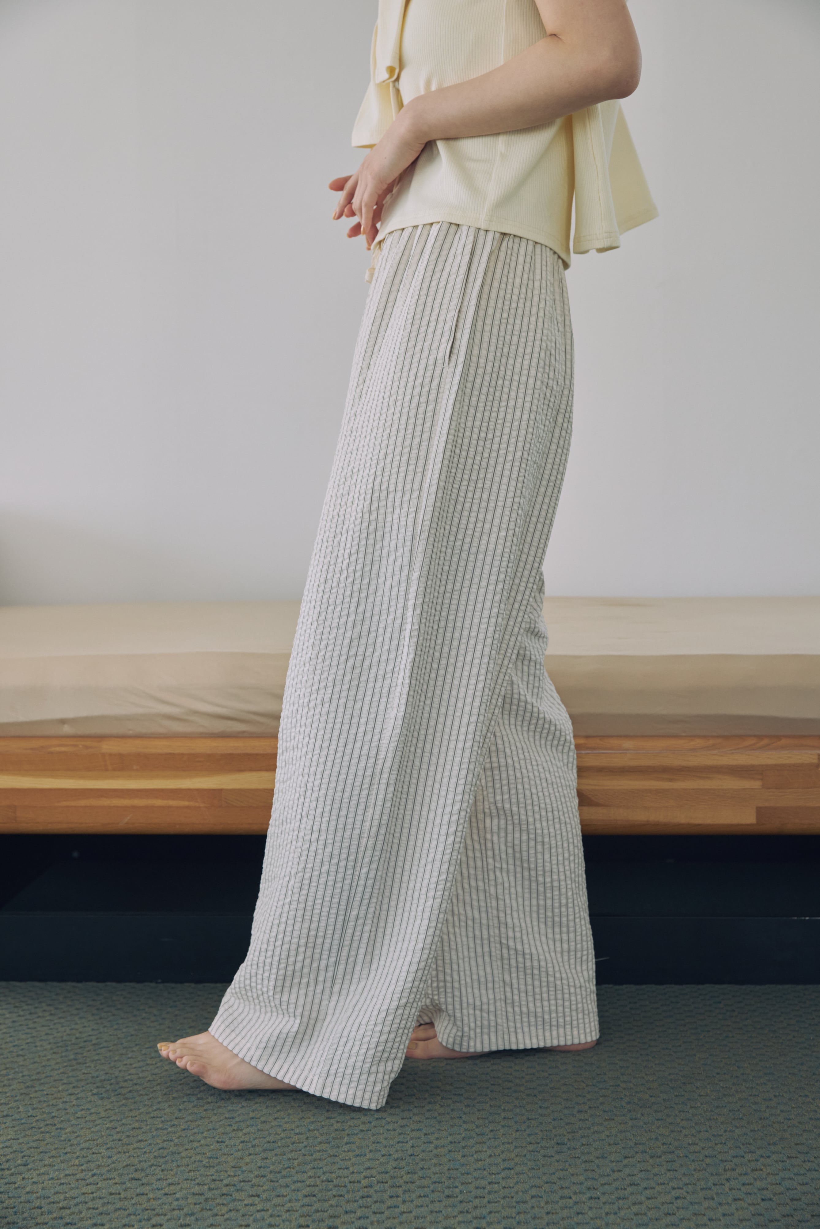 リラックス感がありながらも、縦ラインのストライプがすっきりとした印象に。