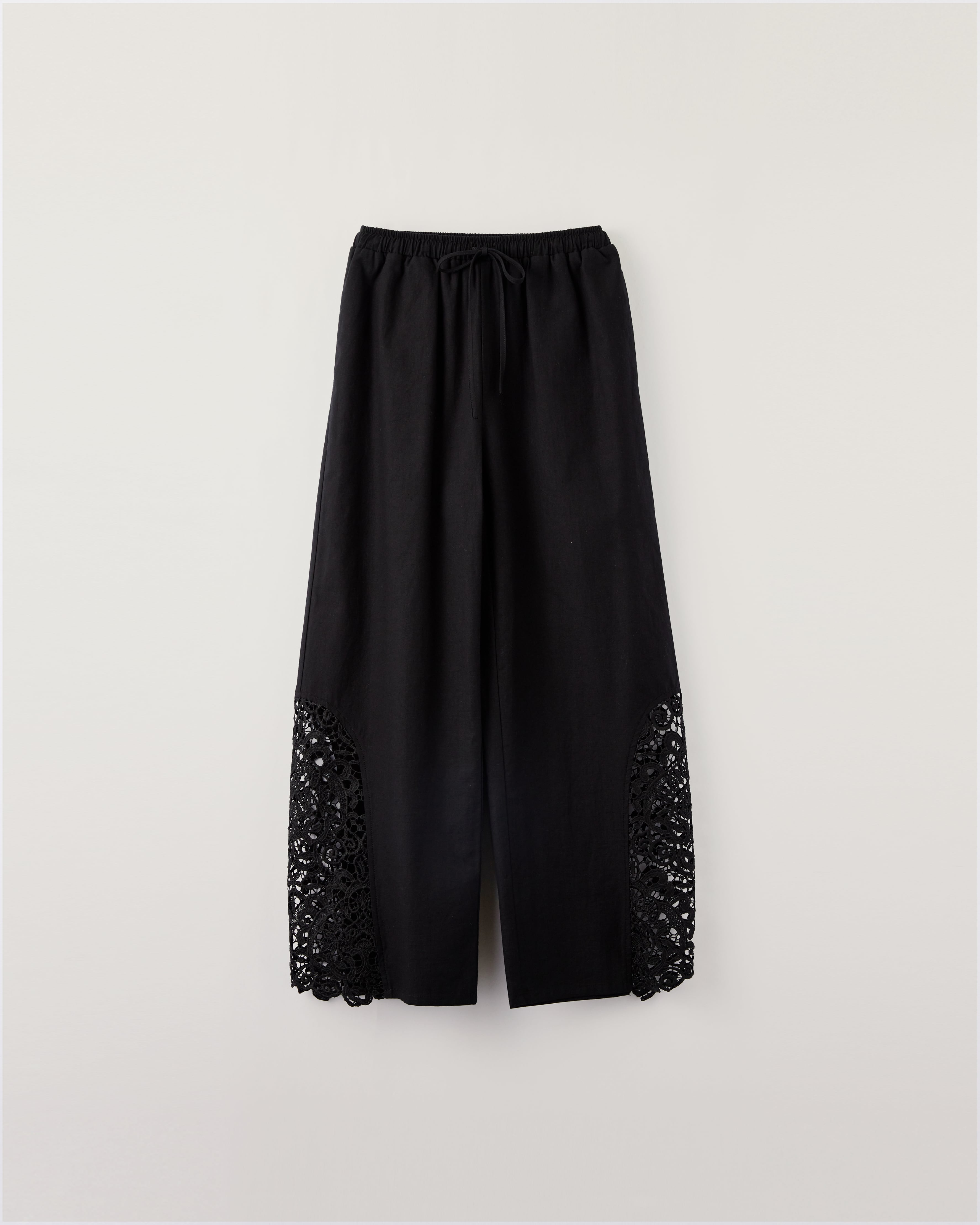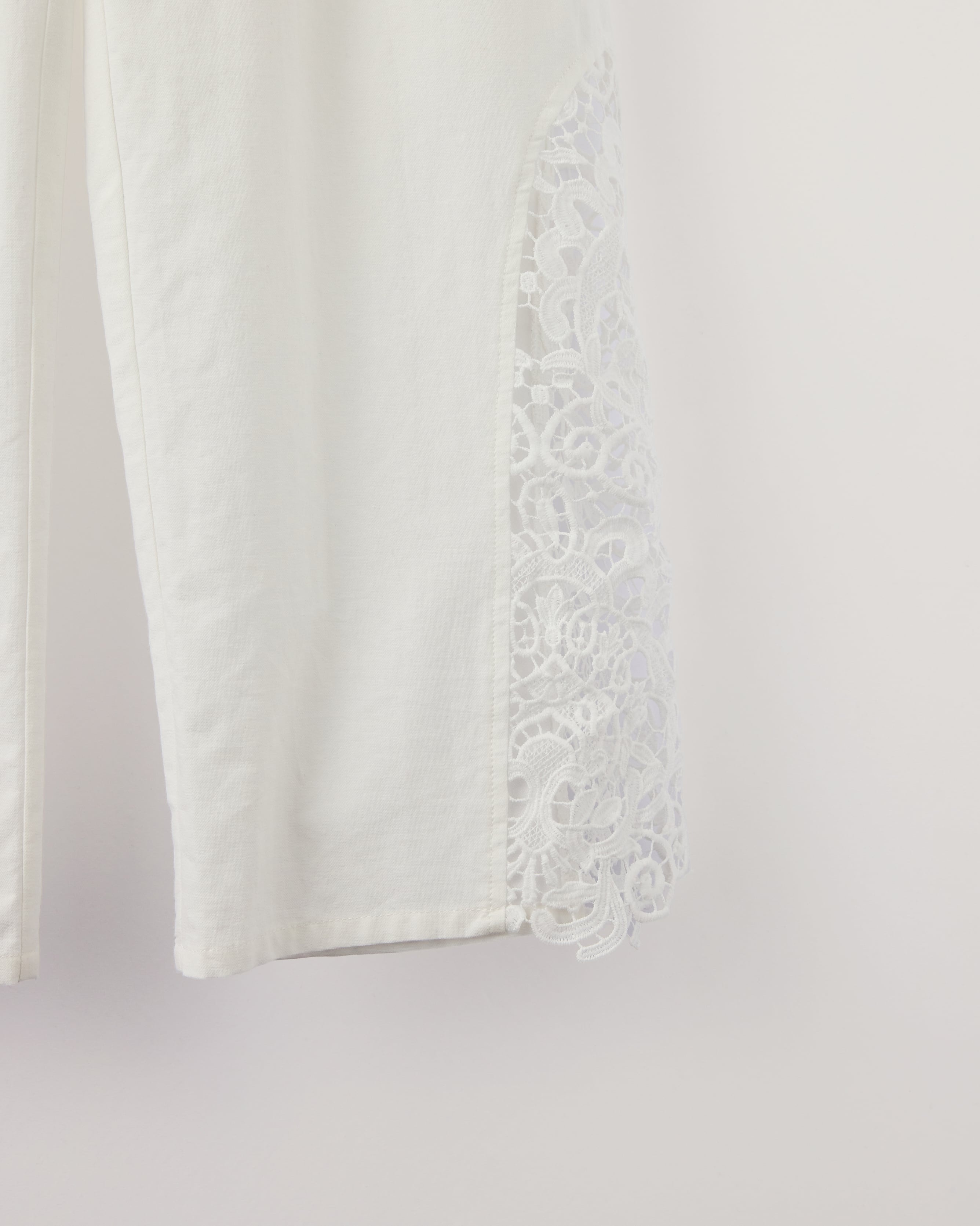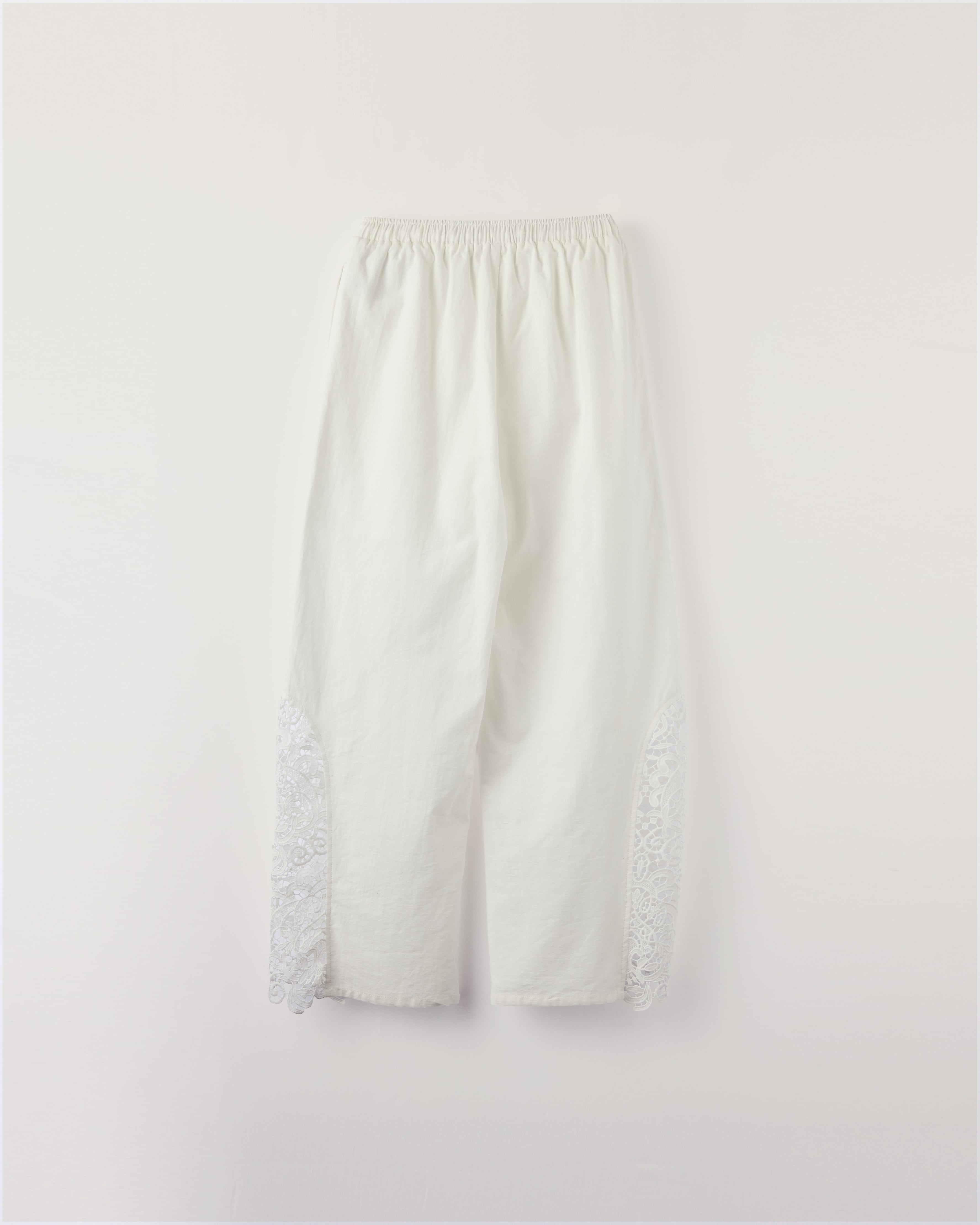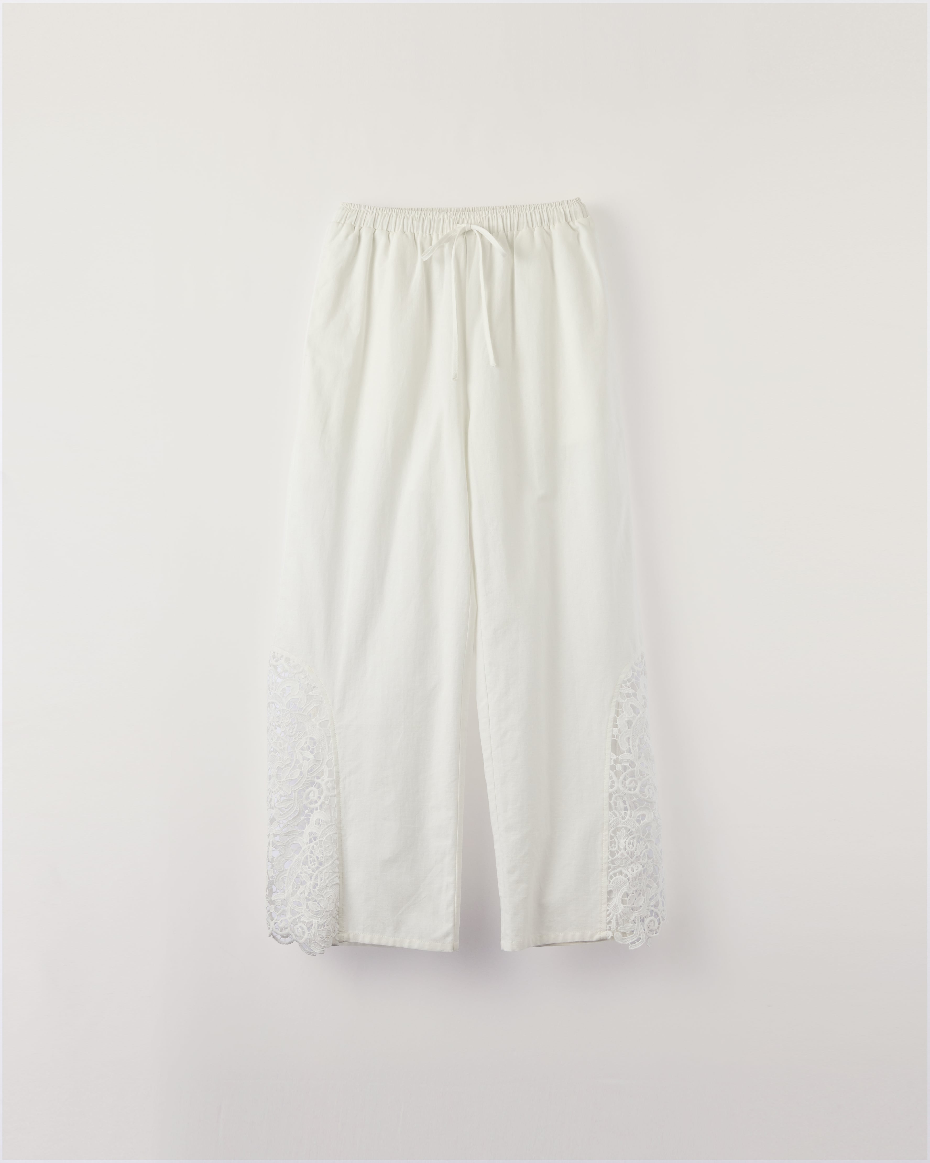 ナチュラルな素材感に、繊細なレースを添えたワイドパンツ。