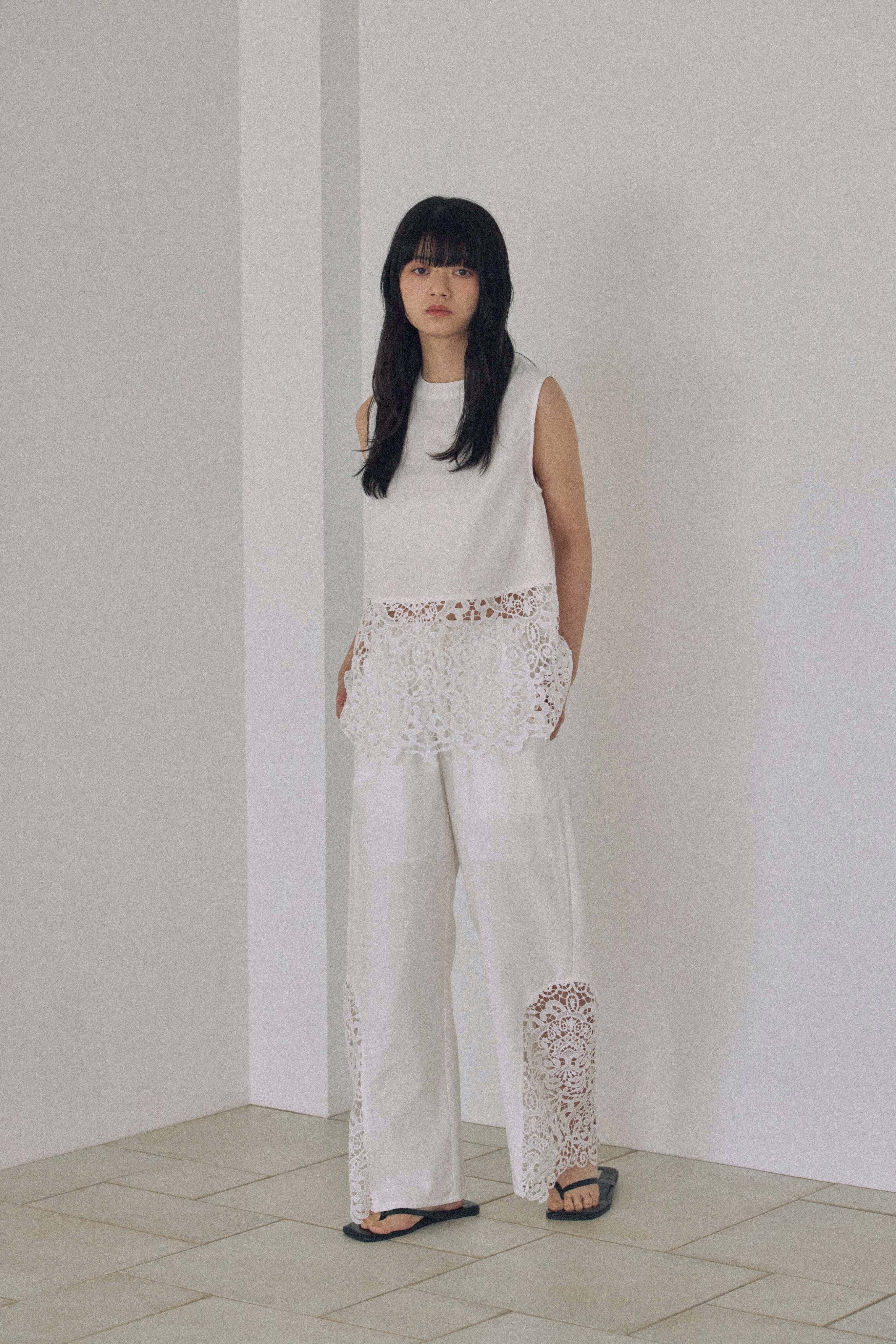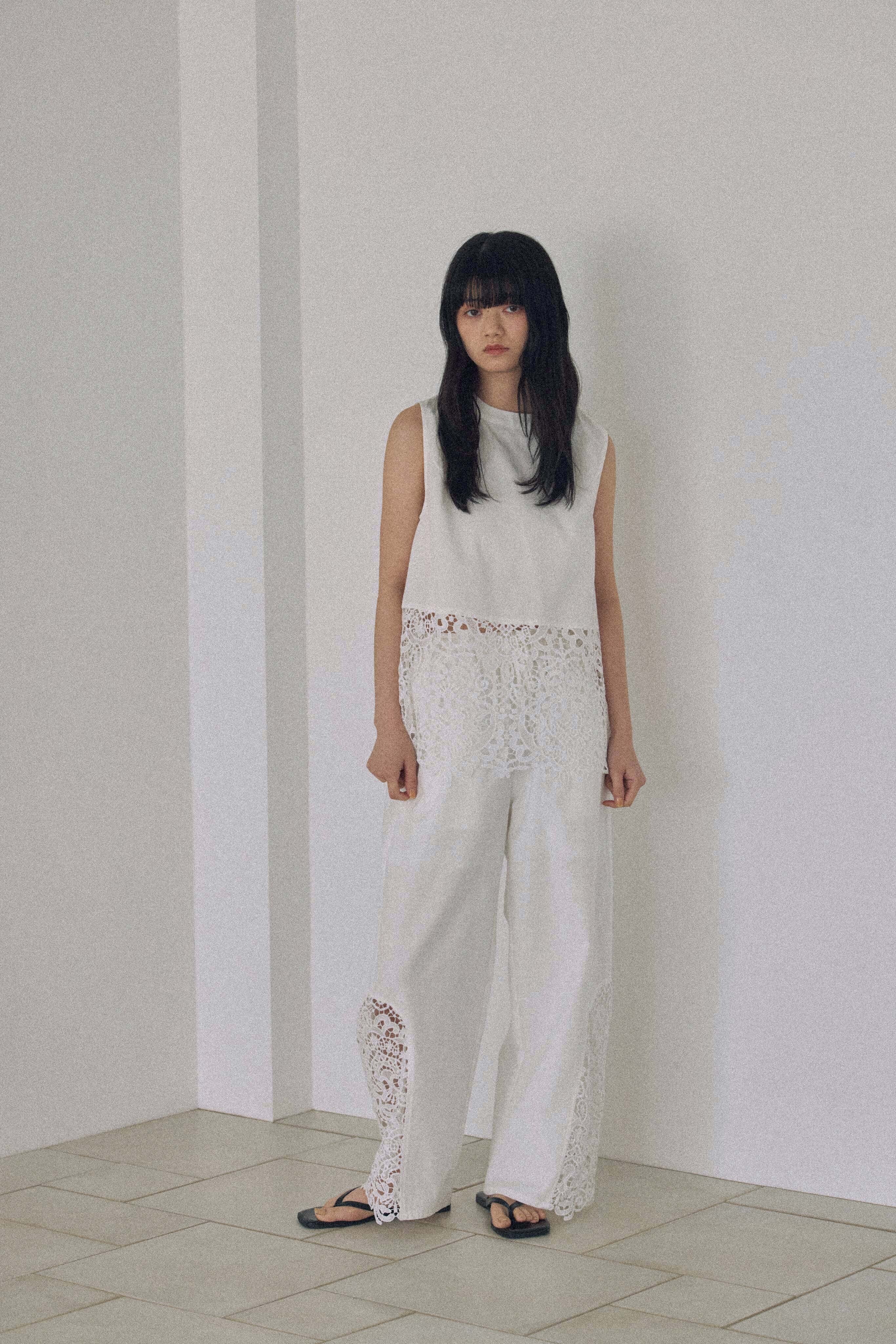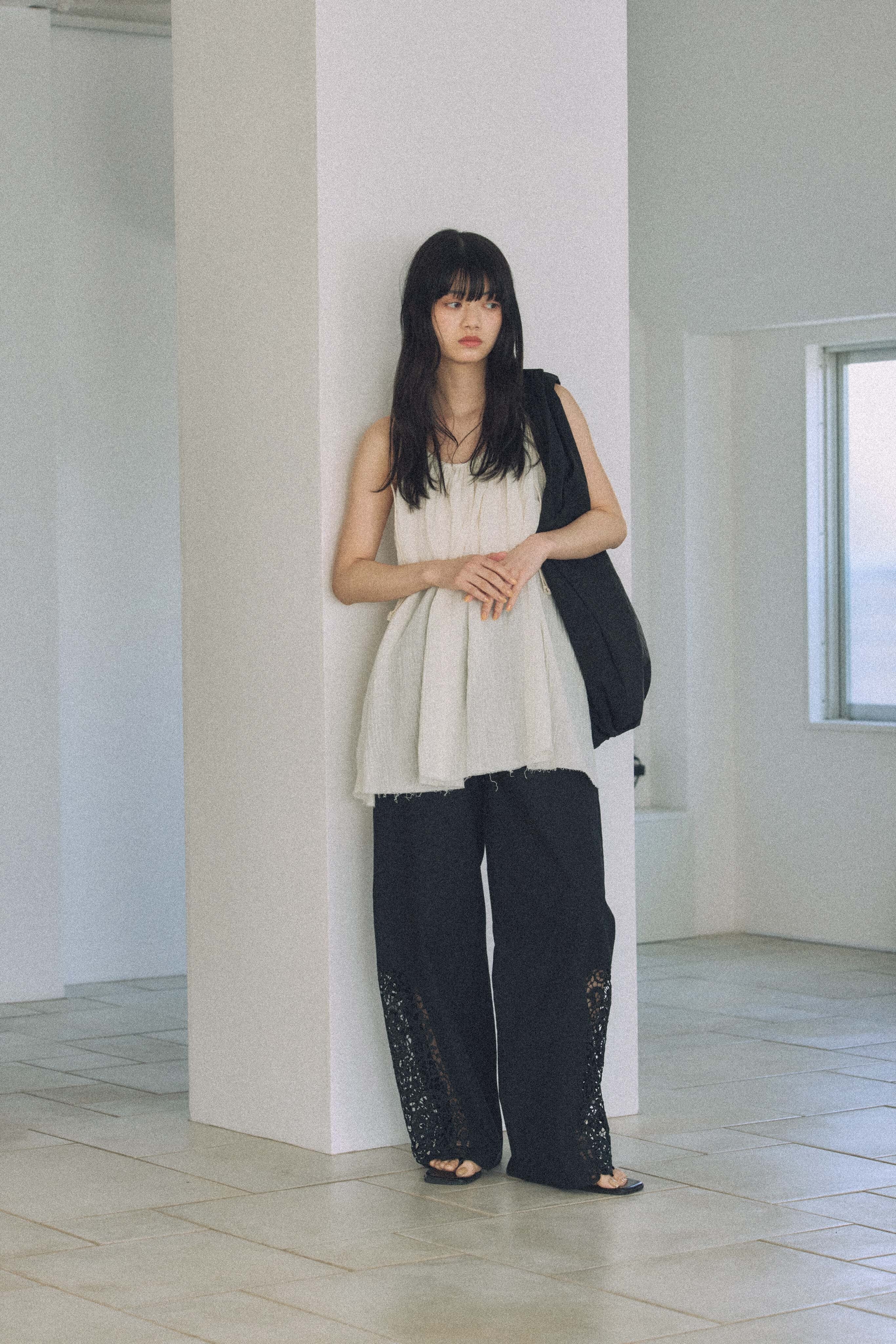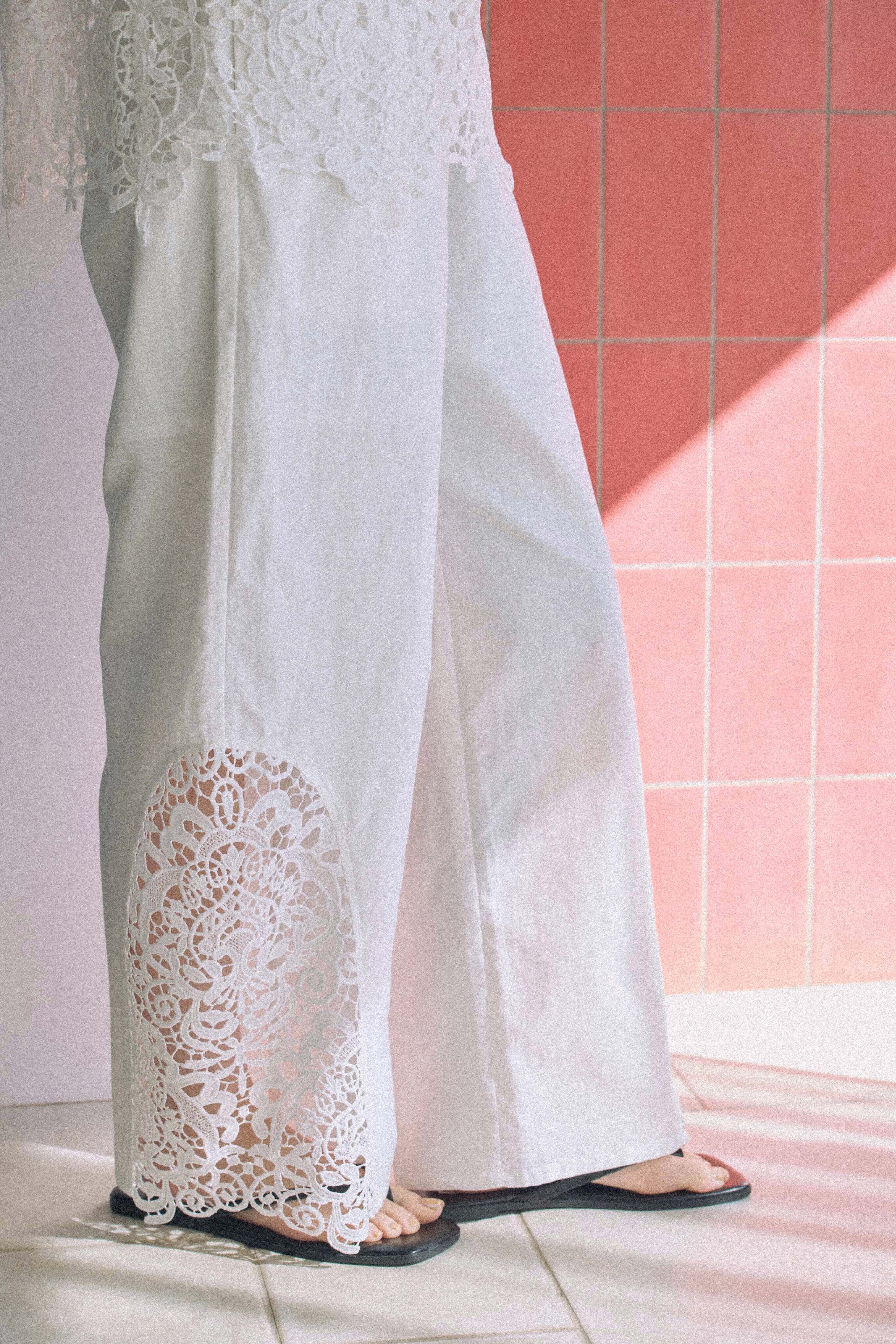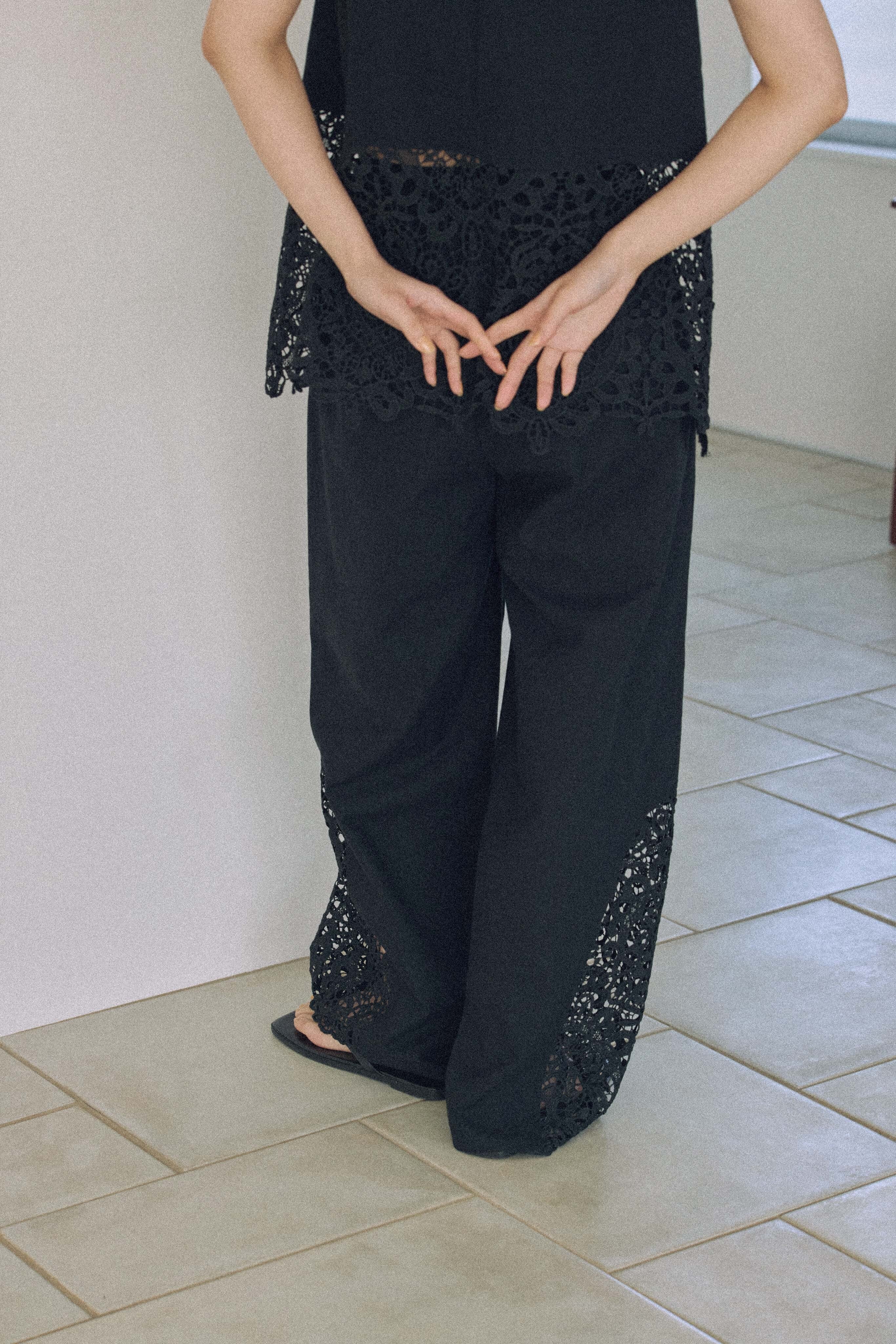 ナチュラルな素材感に、繊細なレースを添えたワイドパンツ。