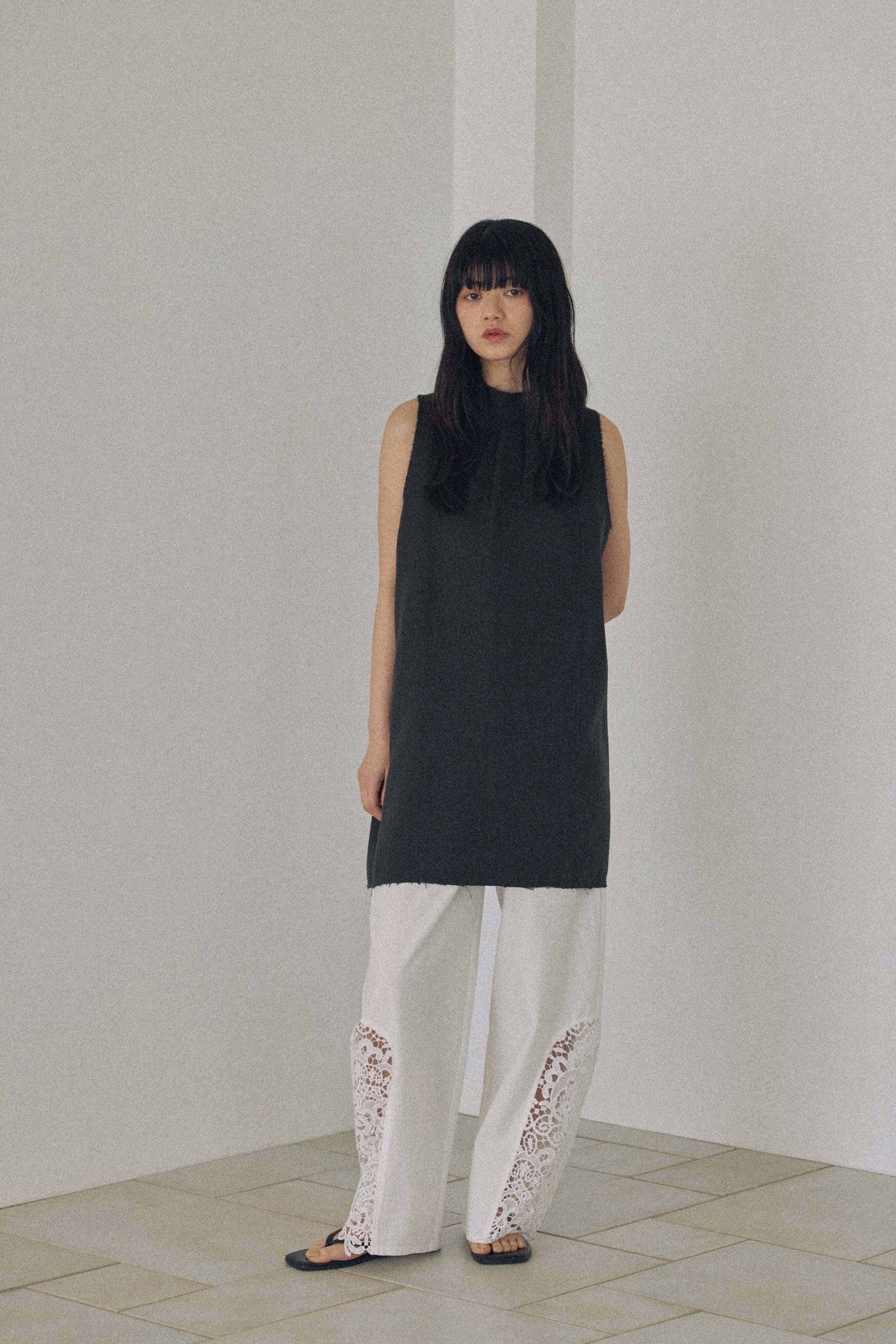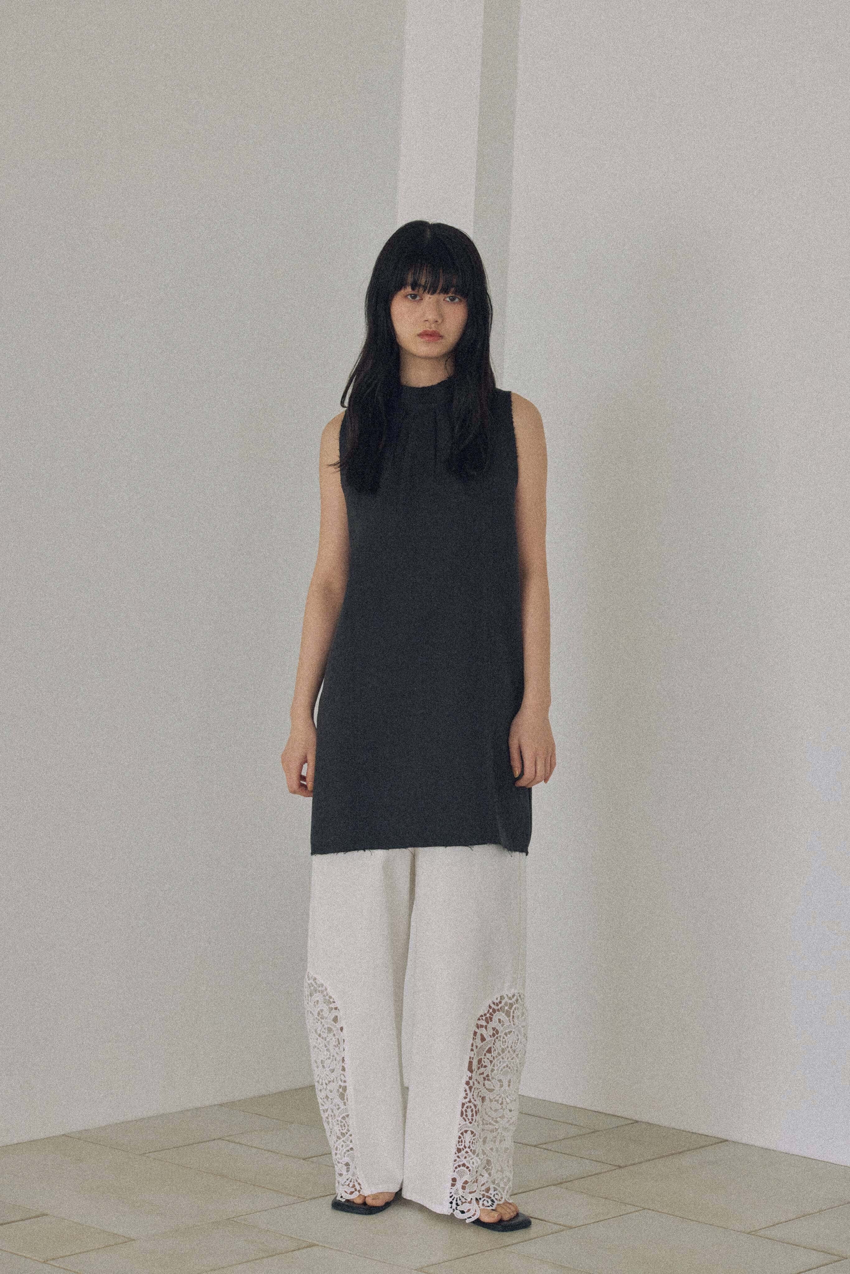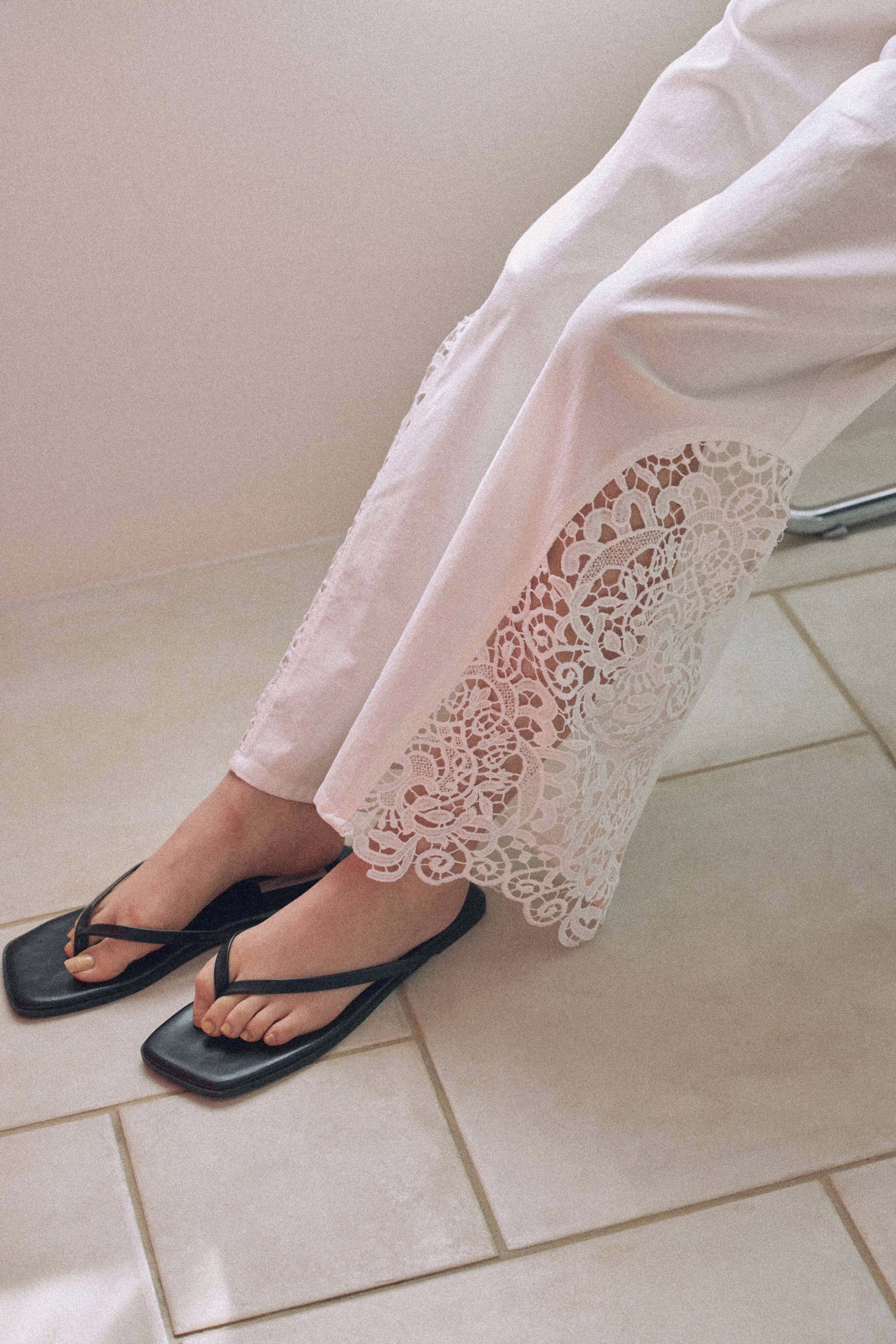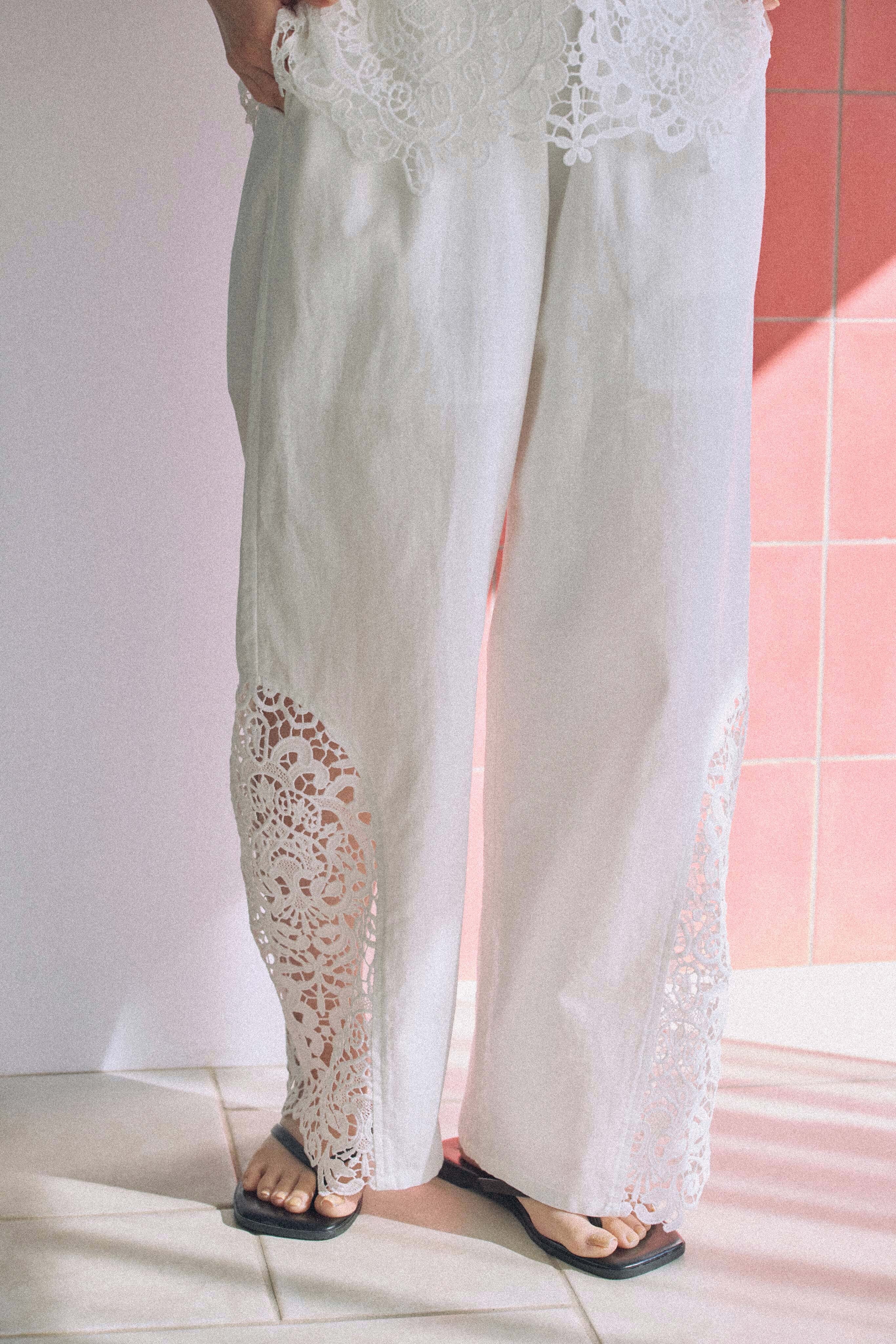 ナチュラルな素材感に、繊細なレースを添えたワイドパンツ。